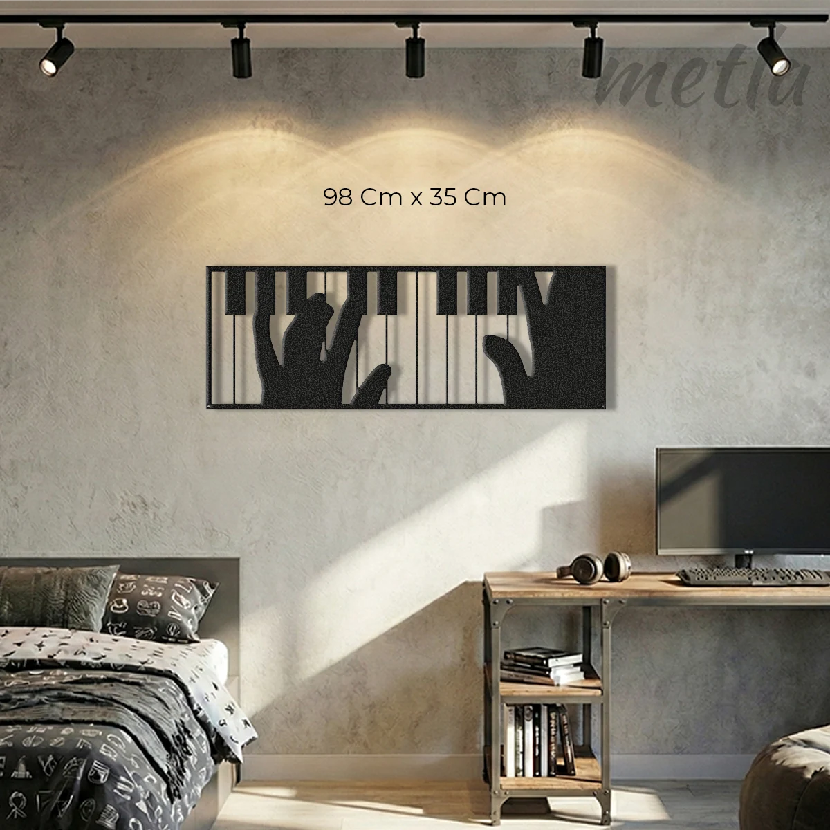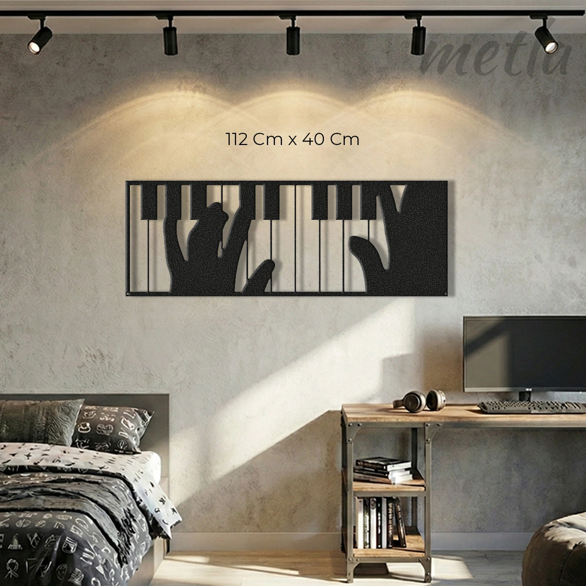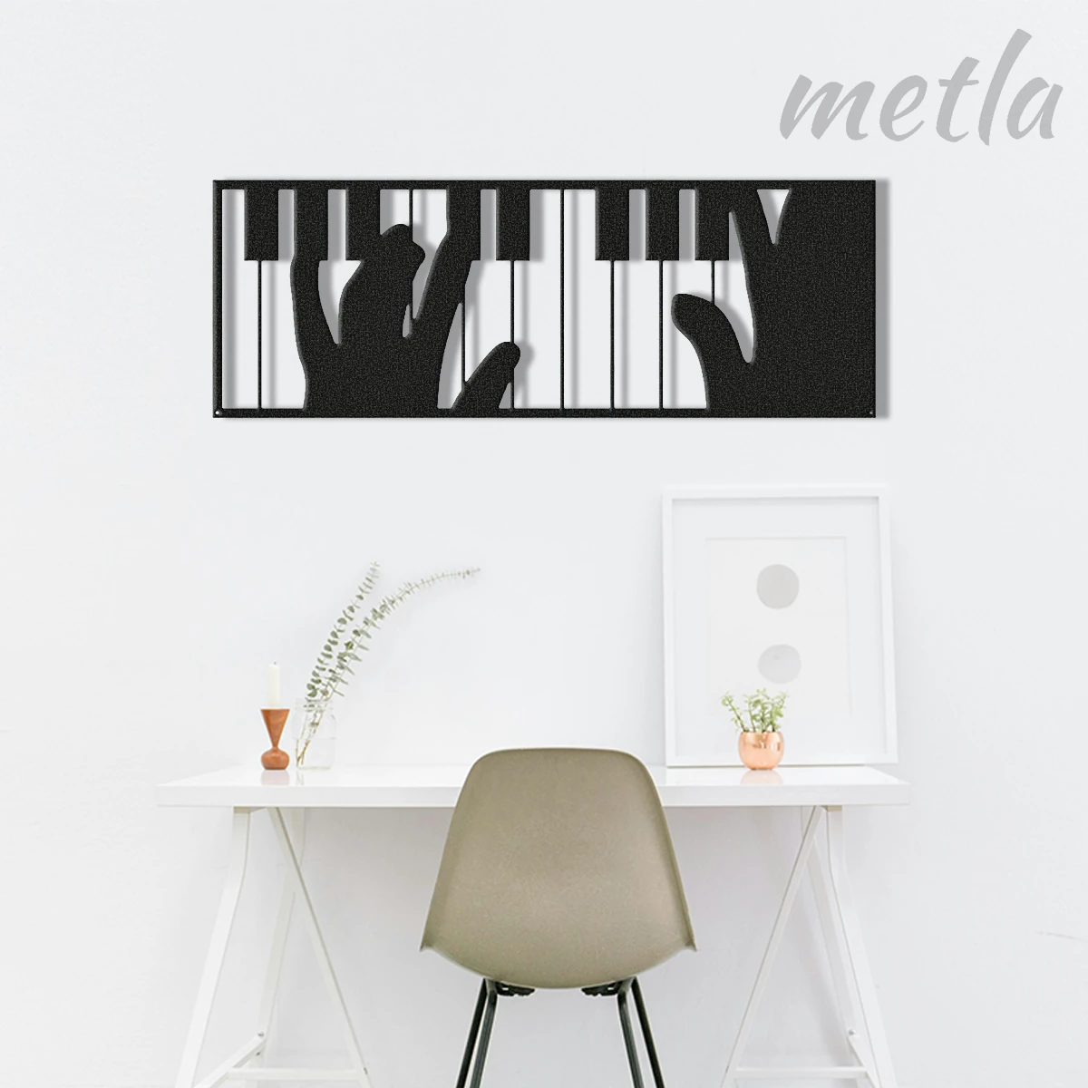 Müziğin akışını endüstriyel tasarımla duvarınıza taşıyın. Metla Piyano Çalan Eller müzik duvar dekoru, 2.0 mm yüksek mukavemetli çelikten üretilen detaylı silueti ve duvardan 1.5 cm önde duran 3D yapısıyla mekanınıza sanatsal bir derinlik katar. Modern stüdyolardan minimalist salonlara kadar her mekanda müzik tutkusunu yansıtan, karakter sahibi bir metal duvar dekoru.